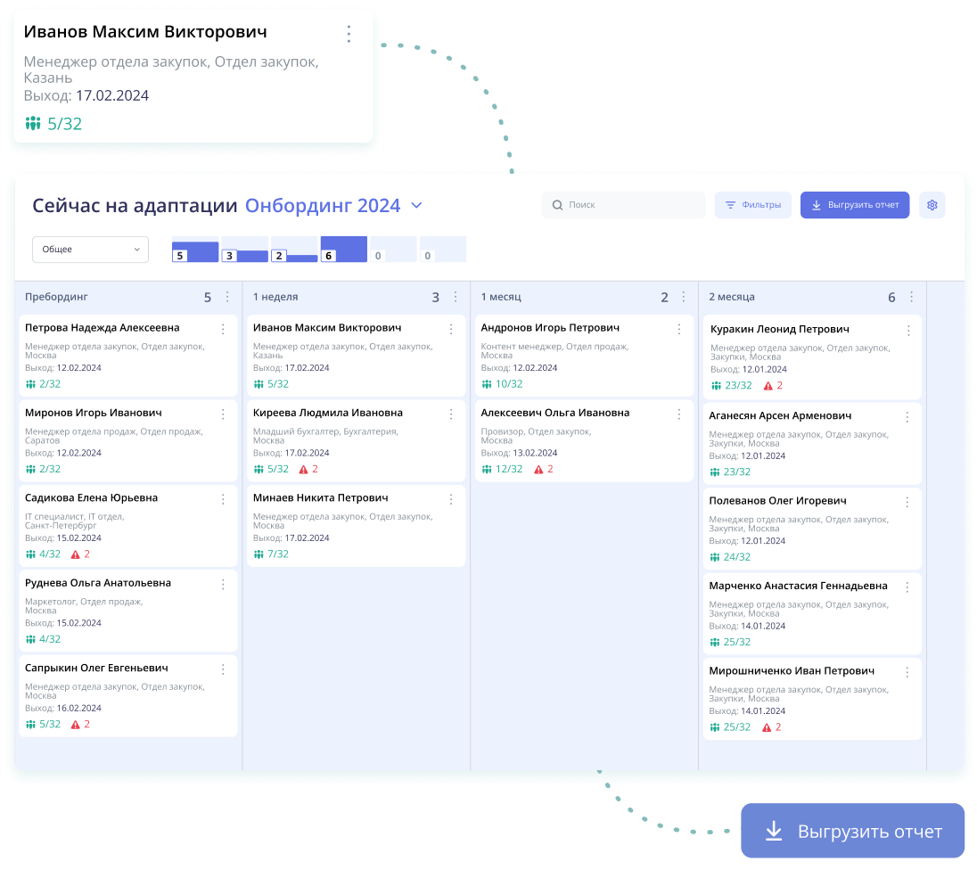 Воронка адаптации покажет, на каком этапе каждый новичок находится прямо сейчас. Аналитика по сотрудникам, отделам и бизнес-юнитам — в один клик.
