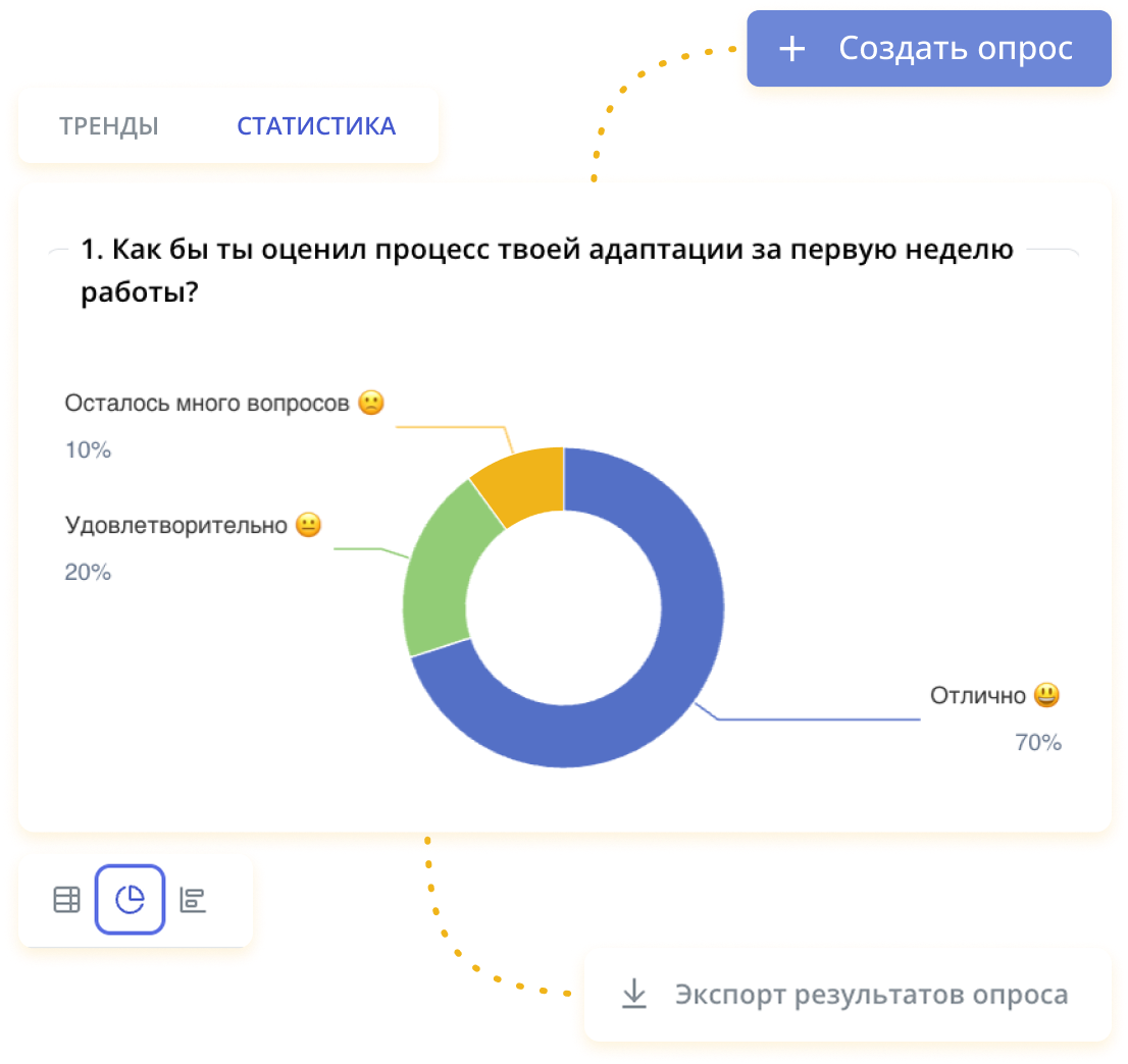 Анализируйте обратную связь от сотрудников в подробных и наглядных отчетах. Выбирайте период, фильтруйте по регионам и подразделениям, следите за динамикой ответов.