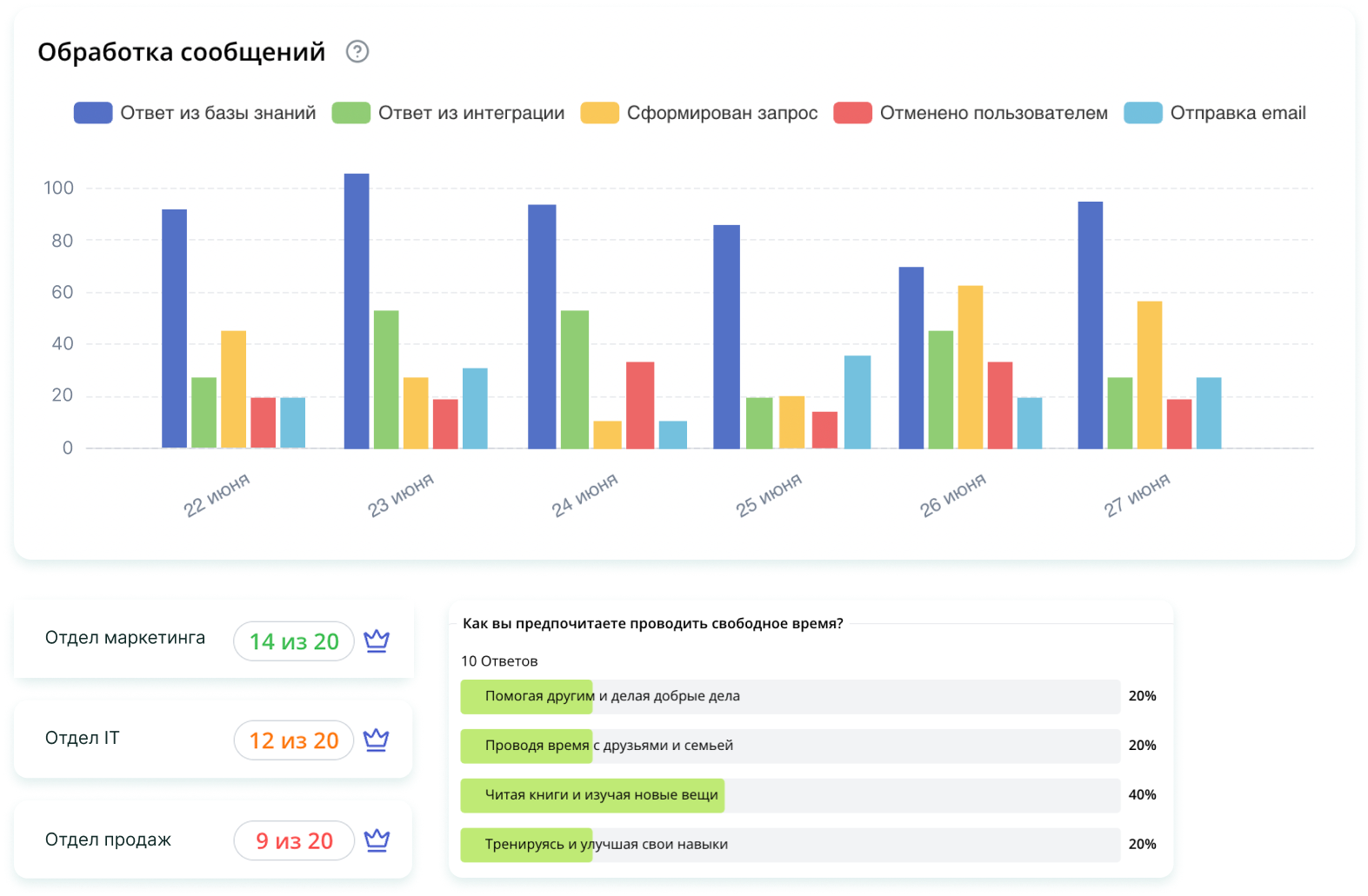 Сценарии, контент, интеграции — всё настраивается под вашу компанию, а аналитика и дашборды помогают контролировать ключевые процессы.