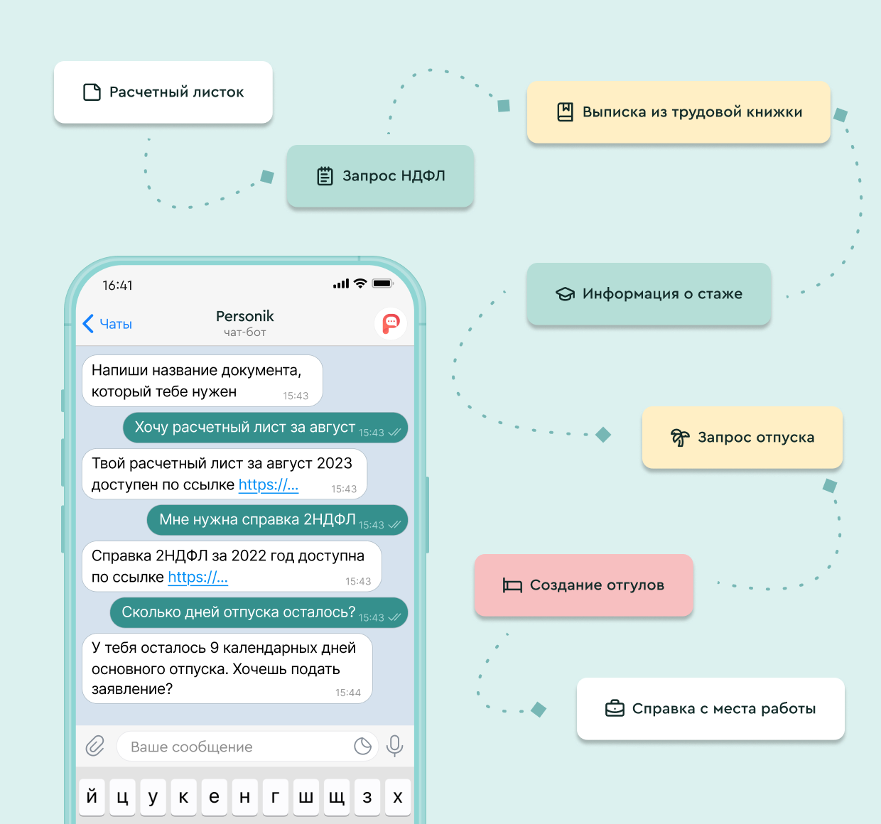 Справки, отпуска, расчетные листки — без писем и ожидания. Сотрудник запрашивает нужный документ или информацию прямо в чате. Personik уточняет детали, обращается в систему — и возвращает результат в мессенджер.